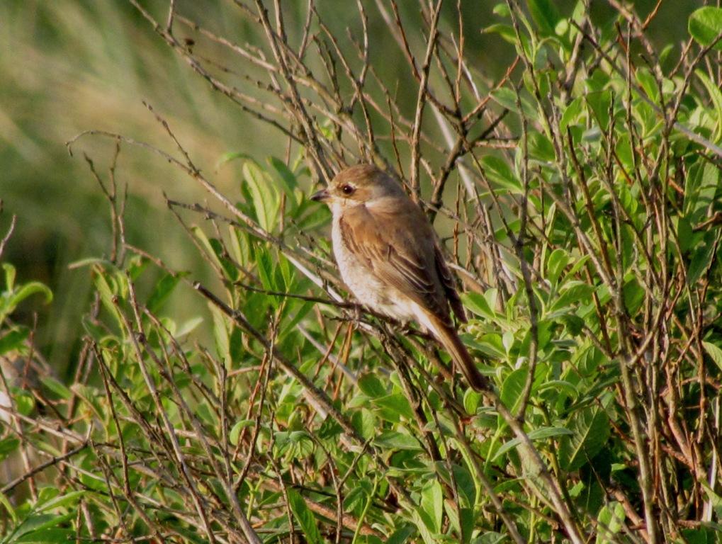 Beskrivelse: Jeg blev i aug noget overrasket over at se denne brune Tornskade. Er det almindeligt at gamle hunner af Rødrygget Tornskade kan se sådan ud. Fuglen har visse karakter der kunne minde om en Isabella Tornskade.