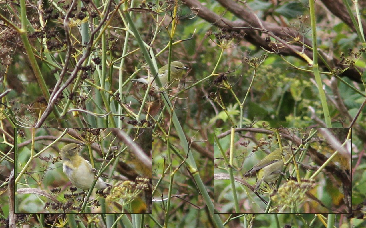 The heavily wind from east made sea watching the only possible solution. A Fea’s type petrel, Sabine’s Gull, jumping Dolphins and 100+ Great Shearwaters were seen. Suddenly you could hear PAC over the walkie talkie mentioning a small yellowish warbler seen very briefly and broadcasted as a possible American wood warbler. The message was soon changed to Tennessee Warbler. The taxi was called and soon 11 men was onboard going uphill for the bird.