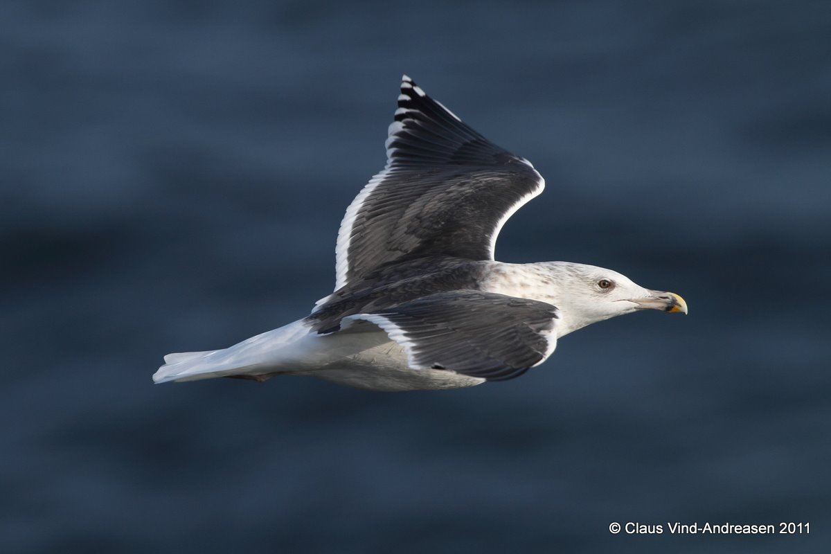 Denne fugle må være en Svartbag. Flere karakterer tyder på dette men de mest væsentligste må være at næbbet virker stort og kraftigt og benene blege, ikke gule. Desuden skal iris vidst være mere gul hos ældre Sildemåge.