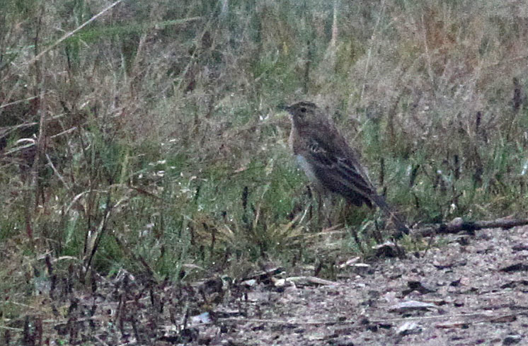 Beskrivelse: I halvmørket var det et rent held at denne Storpiber kunne fotodokumenteres på jorden i den store lysning ved Fuglsangshus, hvor den sås for anden dag i træk.