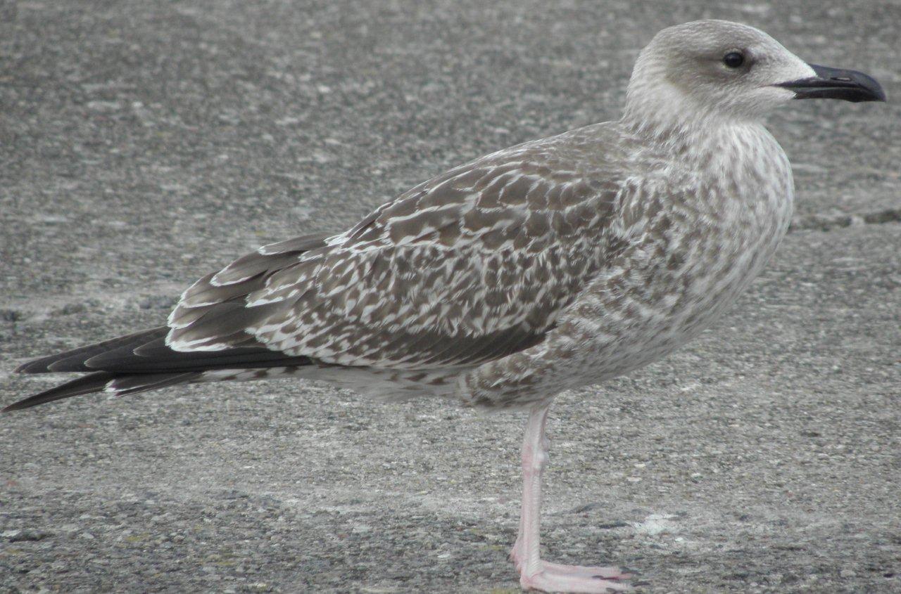 Beskrivelse: Frisk juvenil dragt. Ingen rygfjer skiftet til 1. vidr. endnu. Bemærk: Kraftigt helt sort næb med markant gonysvinkel. Hvidt hoved omkring næbbasis. Mørk stribning på øredækfjer danner maske. Store overvingedækfjer helt mørke yderst og båndede inderst. Lang mørk hånd. Tertiærer har hvid kant på yderste halvdel. Halen hvid med skarpt afsat sort endebånd. Lægger også et flugtfoto for at vise over-/undervinge tegning samt halen.