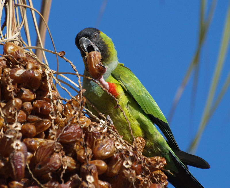 Beskrivelse: En flok på 13 parakitter invaderede dadelpalmerne.