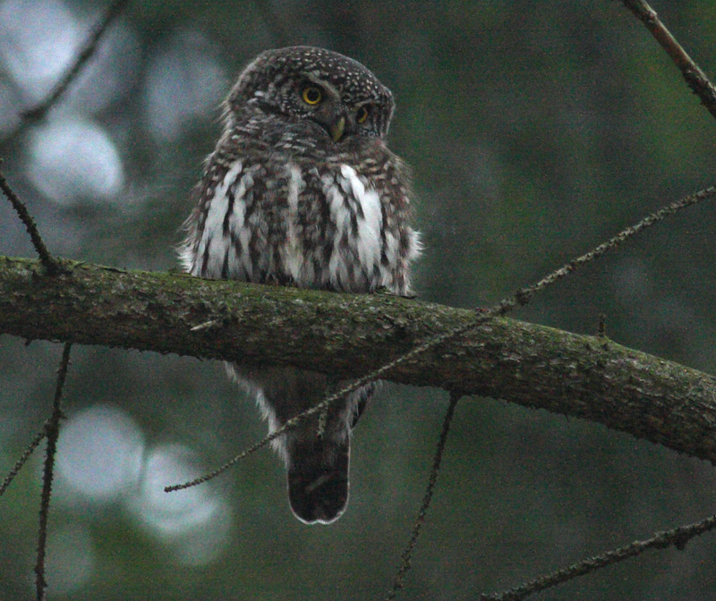 Beskrivelse: Vanskelige fotobetingelser, da uglen holdt til i tæt mørk granskov. Men en nydelse at se den lille ugle, der til tider var ganske aktiv og fløj rundt i en lille område.