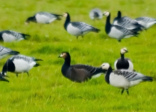 To billeder af samme fugl kan ses på DOF-basen. Søg under ’Sønderjylland, alle observationer, 21/10 2011’. De er lagt ind under observationer af 8000 Bramgæs i Ballum Enge. Det ene billede er oploadet af Kjeld Lund (KL), det andet af mig (TBR). Det var KL, der fik øje på den afvigende fugl.