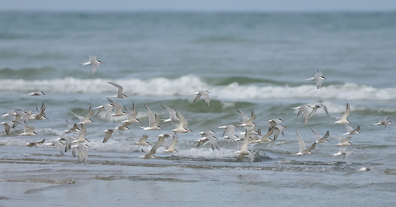 Jeg kan kun finde en sikker Havterne på det viste foto, fuglen som nævnes af SK og THH. Men fuglen til venstre, som THH nævner, kan nok heller ikke afvises som Havterne. Desuden har jeg endnu én mistænkt nederst centralt i billedet, men fotos kan jo snyde. I felten kan man også nemt blive snydt, når det drejer sig om bestemmelse af de to arter; især om foråret, hvor selv fuglekiggere med stor felterfaring tydeligvis bliver snydt. Det vidner især DOFbasen om, hvor der åbenlyst er mange indtastninger af fejlbestemte havterner og fjordterner. F.eks. ved Skagen om foråret forekommer det stort set årligt, at besøgende fuglekiggere har noteret større antal af trækkende havterner, mens lokale fuglekiggere på de samme dage stort set kun har bemærket fjordterner. Men dagstotaler på over 100 havterner ved Skagen om foråret er faktisk usædvanligt og langt fra årligt forekommende. Der er derfor god grund til at være skeptisk over for de store antal fra Skagen, som fremgår af DOFbasen; blandt andet dagstotaler på op til 4000 trækkende havterner.