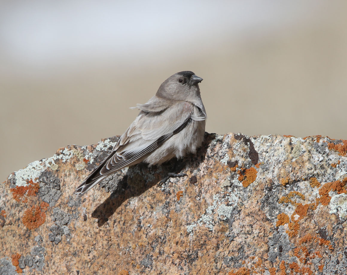 Brandt’s Mountain Finch (Black-headed Mountain Finch) Leucosticte brandti er sammen med Plain Mountain Finch (tidl. Hodgson’s Mountain or Rosy Finch) nogle af de fugle som året rundt giver liv i landskaberne i de karske råkolde Tien Shan bjerge (Himmelbjergene) langs Kirgisistans grænse ind til Kina. Der er ikke mange fugle over trægrænsen, og især ikke om vinteren og i det tidlige forår, men når man støder på bjergfinkerne er det altid interessant. Om sommeren og i de store vinterflokke på flere hundrede individer er BMF temmelig sky – medmindre man uforvarende kommer til at komme reden for nær; så popper de op på den nærmeste sten, og sidder roligt og nedstirrer Klodshans med sine klare sorte øjne. Om vinteren – sidst oplevet for ganske få uger siden, oplevedes flere flokke af BMF der rastløst og ængsteligt flagrede rundt langs de åbne græsarealer i det ellers snedækkede landskab. Umiddelbart ingen prædatorer – fare på færde, eller hur… Måske skyggen af en storfalk i horisonten tolder bestanden nu og da. Hvorfor ellers så forskrækkede?