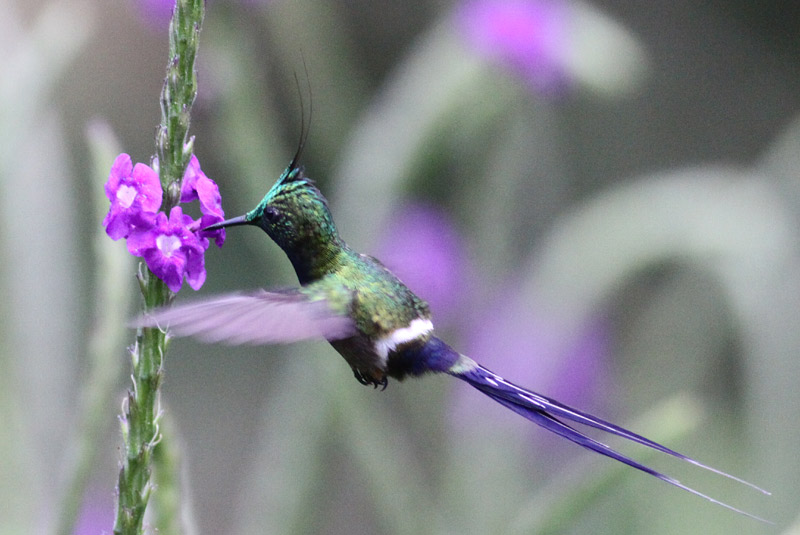 Beskrivelse: Selvom JSH har lagt fine fotos ud af denne særegne art fra Equador vil jeg ikke undlade dette, der viser, hvor blå halen kan tage sig ud i visse belysninger. Men også for at komme med en lidt kedelig meddelelse omkring Cock-of-the-Rock Lodge, der tidligere var stedet at se spillende COTR - spillepladsen er desværre skyllet væk og fuglene kan kun ses på afstand eller høres. Et andet sted, der vitterligt ser meget velegnet ud, var desværre afspærret med hegn og hængelås, så de smukke appelsinfarvede cotingaer højst lod sig se i (ufotogene) glimt.