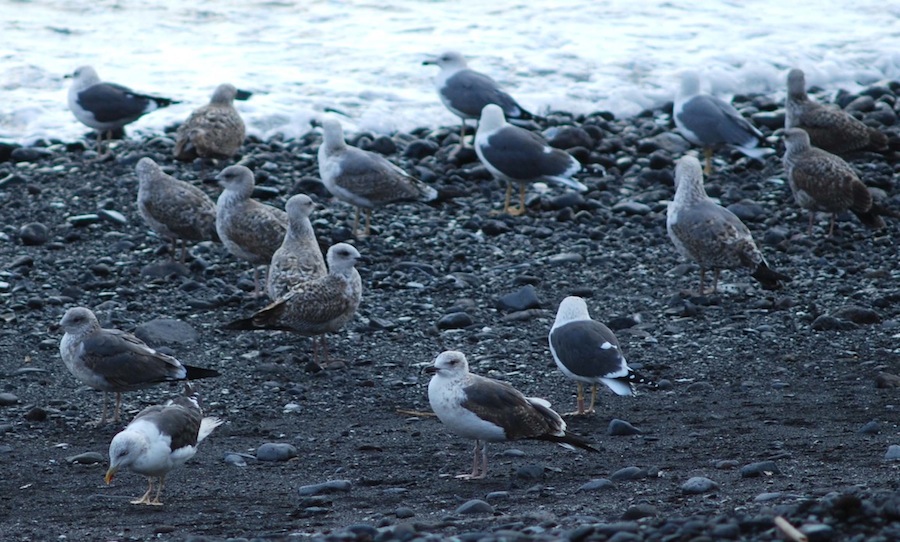 Du ser også den store variation i hvor mørke de vestlige Sildemåger kan være ved sammenligning mellem den nærmeste adulte med ryggen til, og den adulte der står oppe til højre i billedet. Netop fuglen oppe til højre vurderer jeg i en nuance der ligger ganske tæt på Middelhavssølvmågen. Men bl.a. grundet størrelsen, tror jeg det er Sildemåge..