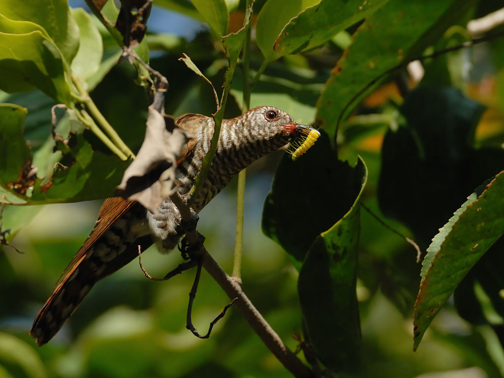 Beskrivelse: This female Violet Cuckoo had found a colony of caterpillars in a spun leaf. It proceeded to eat them one by one at a leisurely pace, sitting quiet up to 30 seconds between each prey item.