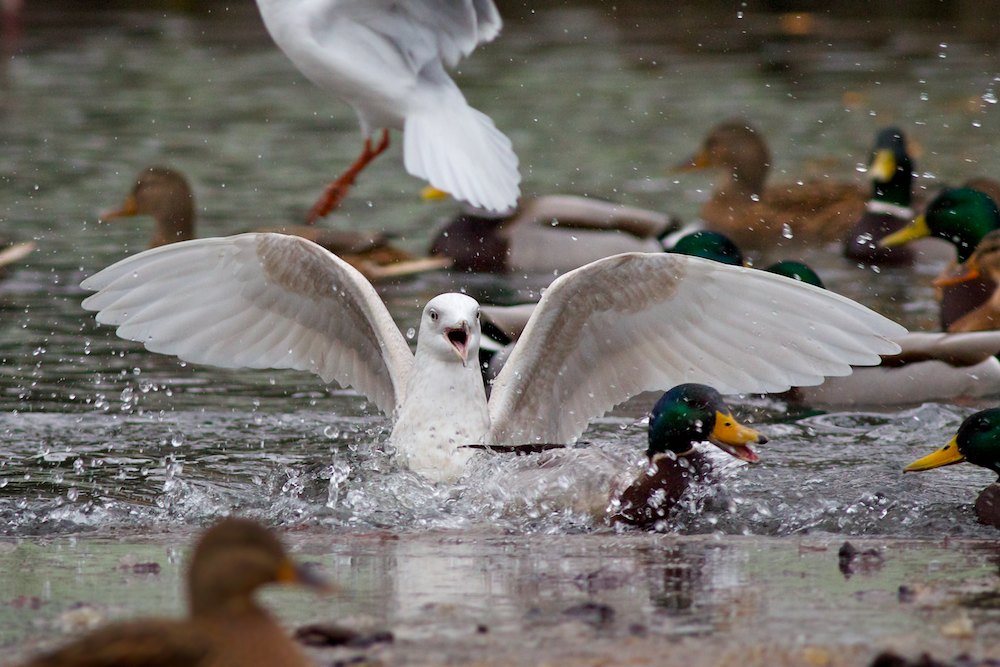 Beskrivelse: Den hvidvingede måge var meget aggressiv overfor gråænderne og hættemågerne.