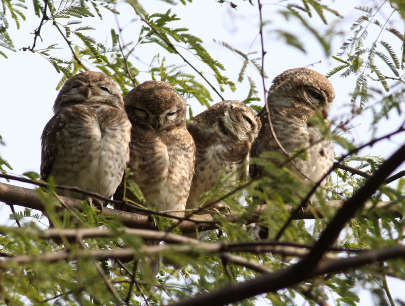 Beskrivelse: Spotted Owlet er den ugle, man lettest ser i indien. Den er almindelig og sidder ofte helt frit fremme. Denne gruppe er fotograferet lige ved templet i Keoladeo Ghana - også kendt som Bharatpur. Når man holder pause her er det en idé at scanne himlen for Indisk Skrigeørn, der tit ses i display lige over stedet.