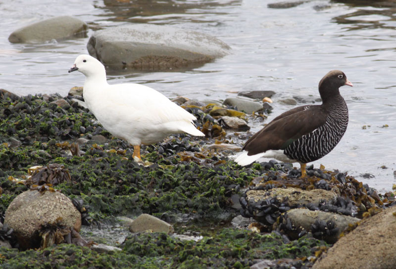 I de par vi så, var der altid tale om en hvid og en broget type,som her. Immature hanner har hvidt hoved og spredte hvide fjer i en ellers hunlignende dragt, men i par så allesete ud som disse to fugle.