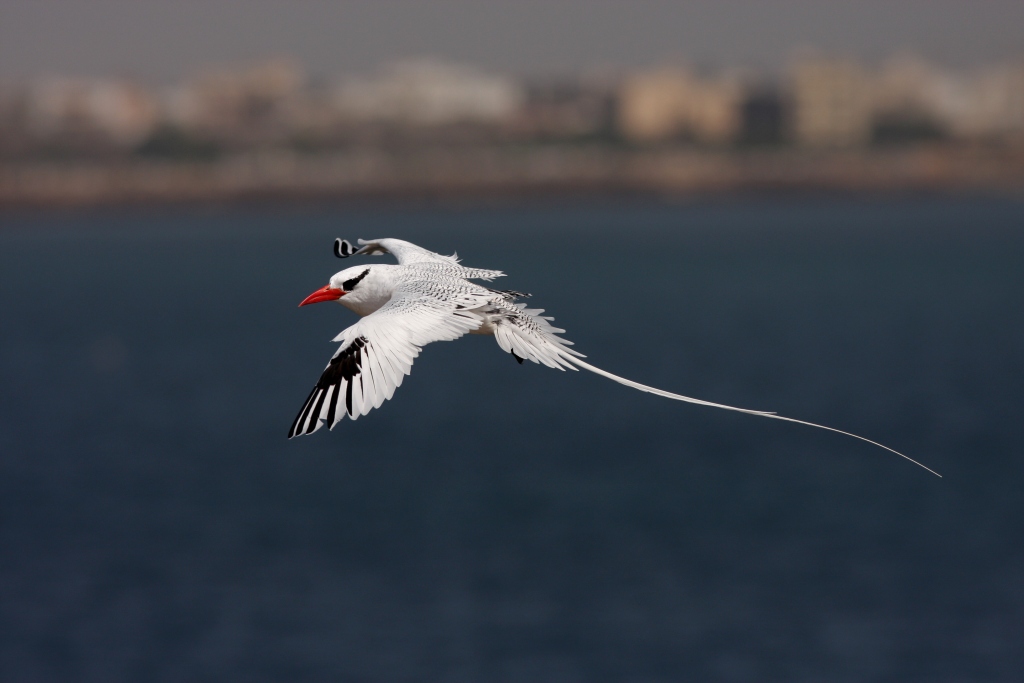 Beskrivelse: Flere par yngler regelmæssigt på en lille ubeboet ø et par km fra millionbyen Dakar, som ses i baggrunden.