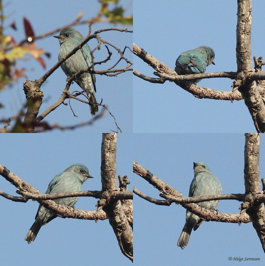 Din øverste fugl til højre viser noget af det man også bemærker på Arnes fluesnapper; nemlig en blå svingfjer, der bliver sorte i spidsen samt ikke mindst sort håndsving-projektion.