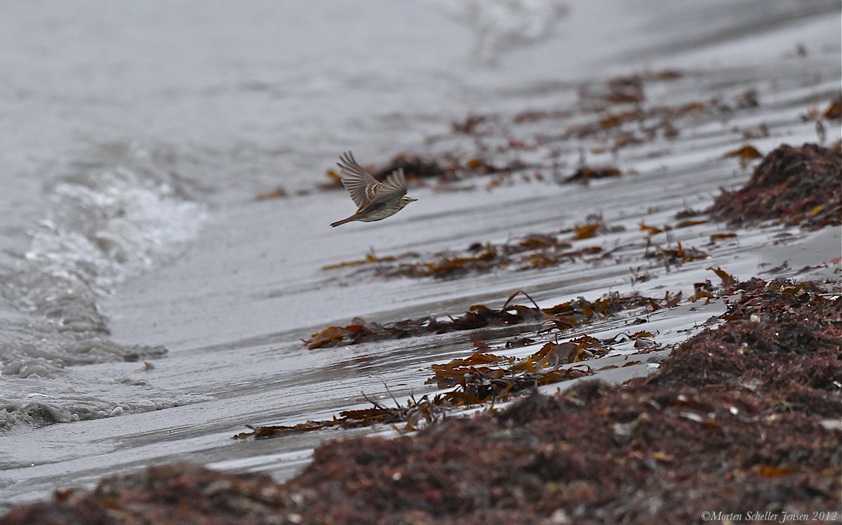 Beskrivelse: Doku-skud af flyvende Bjergpiber man ser tydeligt den hvide øjenbrynstribe men desværre ikke de hvide halesider.