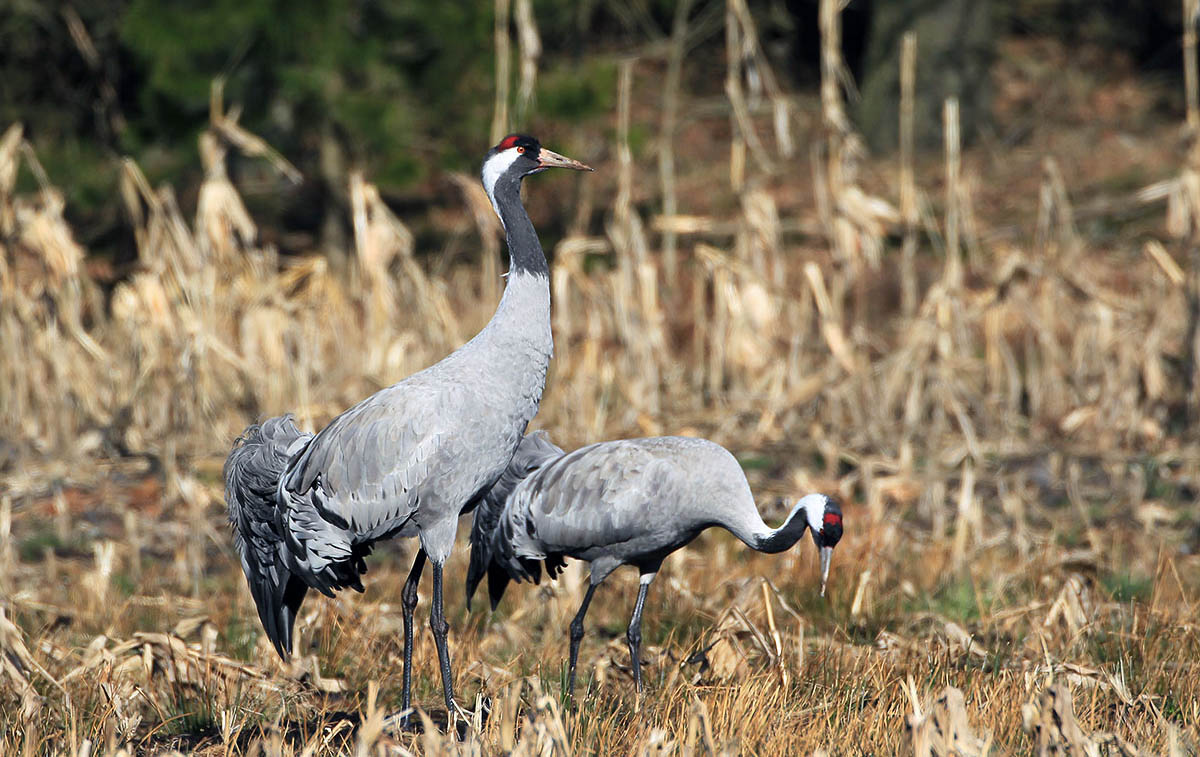 Beskrivelse: 2 af 6 traner på majsmark - fotograferet fra fotoskjul.