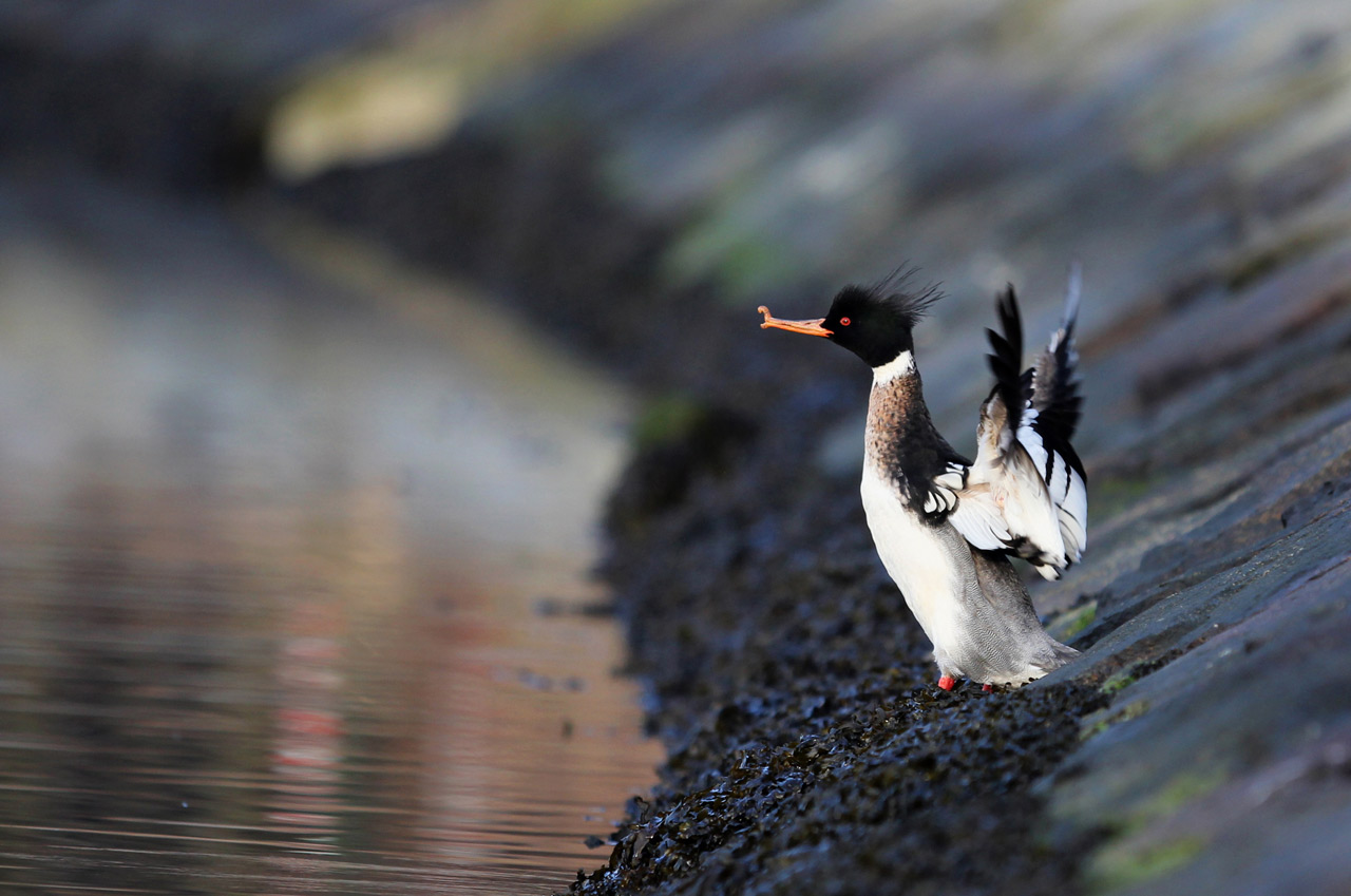 Beskrivelse: This red breasted merganser enjoyed the winter sun in Bergen, Norway. Obviously a deformed beak, but it has survived the autumn at least!