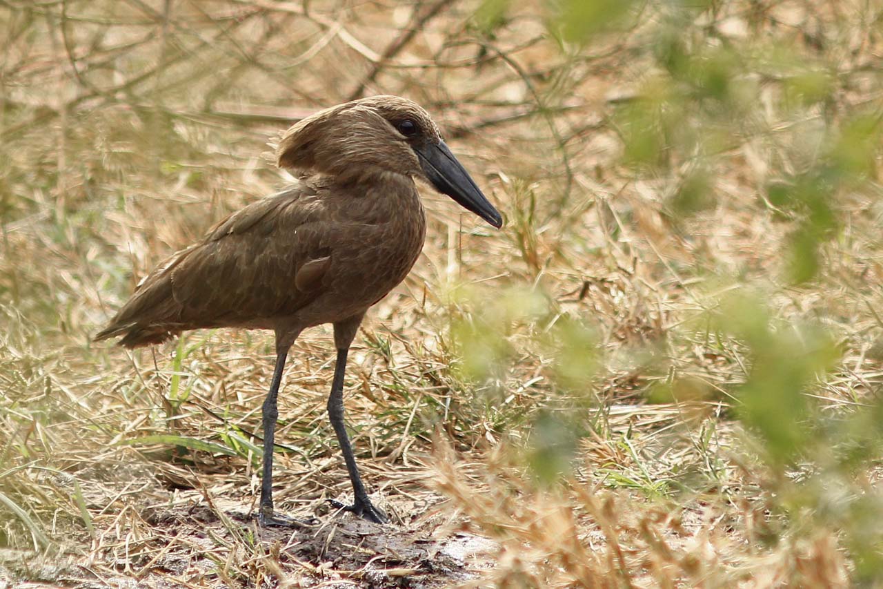 Beskrivelse: Havde kun set Hamerkop`en overflyvende i ret stor højde et par dage før, men pludselig gik den 6-8 m foran os i bushen og fouragerede
