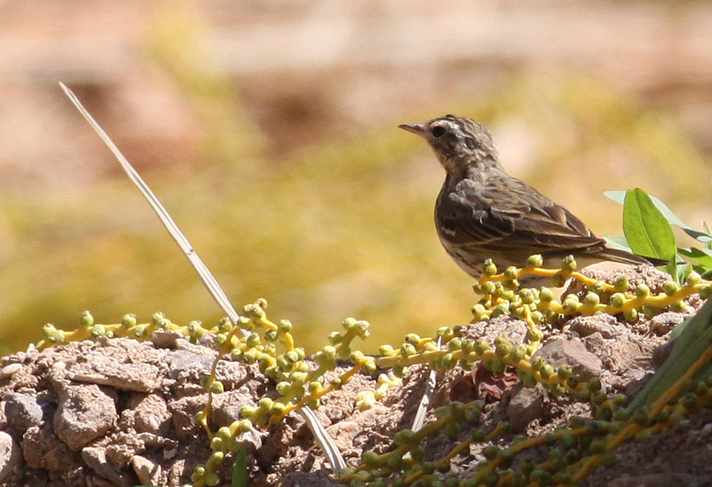 Beskrivelse: Én af 2-3 Tajgapibere, der holdt til i den meget fuglerige palmelund nord for grænseovergangen mellem Israel og Jordan. Her ser man i forhold til skovpiber mindre næb og mere gråtonet grøn overside uden brunoliven toner (! ja ja, på trods af navnet Olive-nacked Pipit er slidte forårsfugle forbavsende gråtonet grønne på ryggen. Ryggen er stort set ustribet. Det allertydeligste kendetegn er dog det påfaldende hvide øjenbryn, der er langt tydeligere end nogen anden karakter; på Skovpiber er det normalt det hvide, forreste vingebånd, der er dragtens tydeligste tegning.