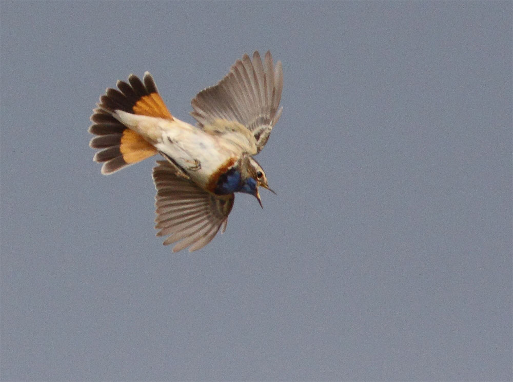 Beskrivelse: Sydlig Blåhals uden hvid plet i den blå hagesmæk