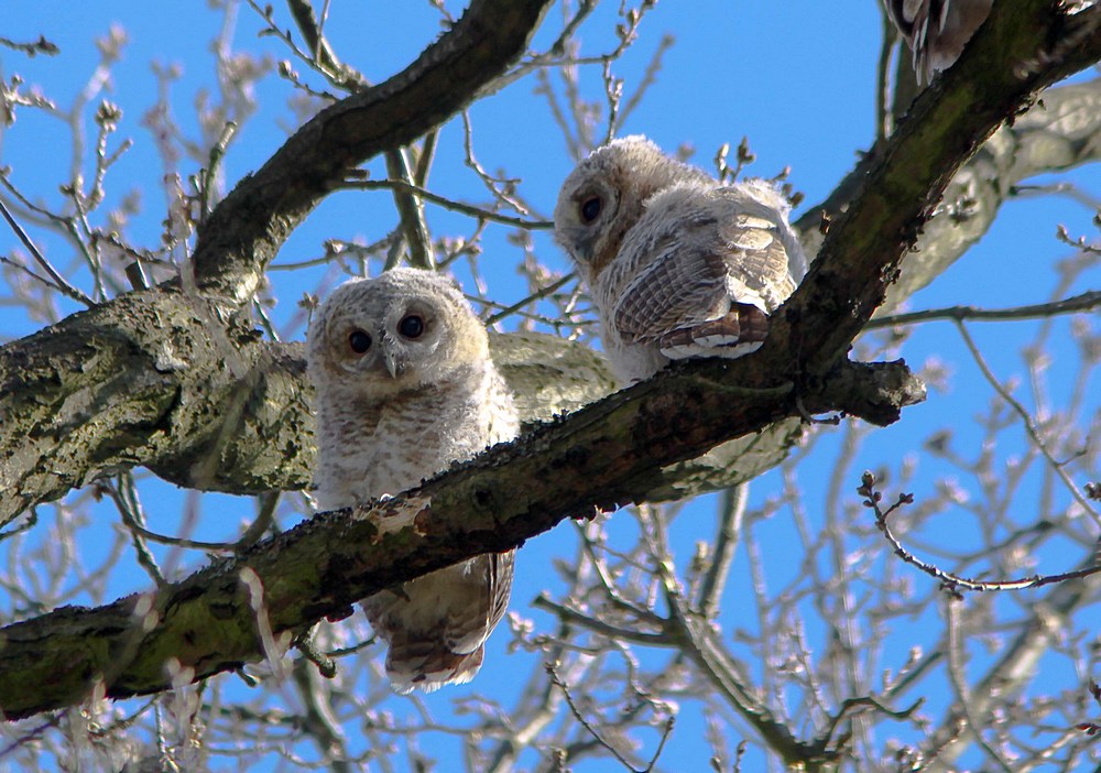 Beskrivelse: De tre ugleunger sidder normalt stille samme sted hele dag, men i dag var det anderledes. De fløj fra træ til træ og lod sig villigt fotografere. Det var dog ikke muligt at få dem til at kigge samme vej samtidig.