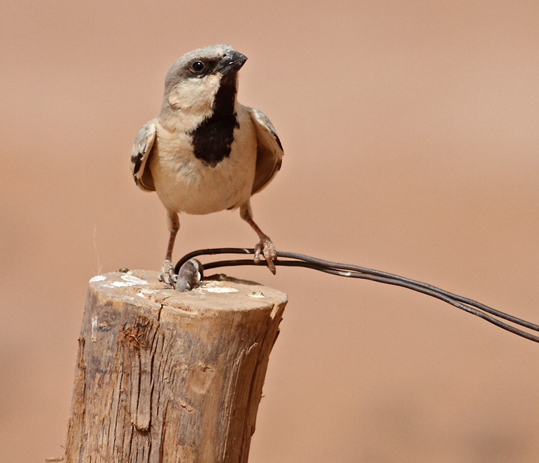 Beskrivelse: Ørkenspurv er en af de fugle jeg rigtig gerne vil se. På en uges Marokko tur boede vi to dage i Zagora tæt på Sahara på et hyggeligt hotel "La Petetite Kasbah" (www.hotelzagora.com) hvis ejer gjorde alt for at vi kunne bo godt. Hjemmefra havde jeg mailet med tur-selskabet: www.caravanedesertetmontagne.com og dens ejer Brahim Mohamed Elaabdouli for at arrangere en 1-dags tur til Ørkenen vest for M'hamid, som er den sydligste by før Sahara (og tæt på Algeriet). Det var en god ide - de havde forståelse for mine "fugle-krav" og jeg har mistænkt dem lidt for at lægge foder ud til ørkenspurvene inden vi kom til et raste sted midt i sandet (han og hun set). Det lykkedes mig dog inden at finde et par i nogle af de få træer der er i Sahara. I øvrigt kom flokke af nysgerrige ørkenravne tæt på vores raste sted.