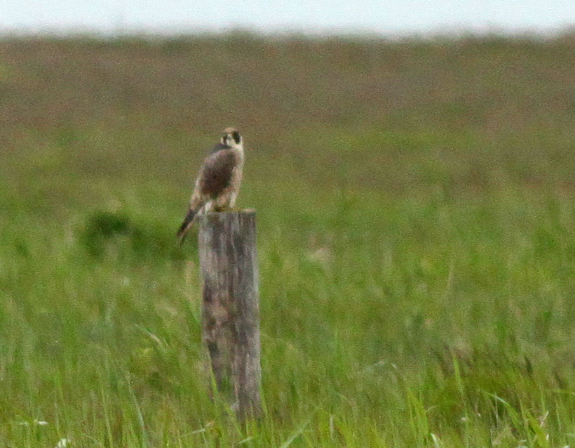 Beskrivelse: Fuglen sad på en hegnspæl 200 m inde på Nyord nordeng (set fra ca 16.00 af BjH)til den lettede og fløj bag om kirkegården og forsvandt NV-på ant. mod Sjælland 16.50. Jeg tror mest på en hybrid evt. Vandrefalk x Lannerfalk eller andre hybridkombinationer, hvor både Vandrefalk og Lannerfalk delvist indgår ?? Stor størrelse, lange smalle vinger og ret lang hale i flugt, lys næsten hvid underside med smalle mørke bryststriber og lidt bredere tværbånd på flankerne samt rustfarvet isse tyder alt sammen på Lannerfalk-gener. Bred sort maske og skægstribe samt sodsort forryg er mere hen mod et Vandrefalke-indslag. Fuglen havde ikke ringe eller stropper på benene. Kommentarer er meget velkomne