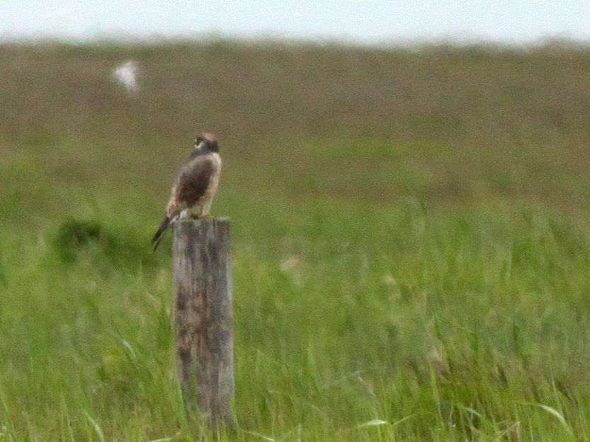 Beskrivelse: Fuglen sad på en hegnspæl 200 m inde på Nyord nordeng (set fra ca 16.00 af BjH)til den lettede og fløj bag om kirkegården og forsvandt NV-på ant. mod Sjælland 16.50. Jeg tror mest på en hybrid evt. Vandrefalk x Lannerfalk eller andre hybridkombinationer, hvor både Vandrefalk og Lannerfalk delvist indgår ?? Stor størrelse, lange smalle vinger og ret lang hale i flugt, lys næsten hvid underside med smalle mørke bryststriber og lidt bredere tværbånd på flankerne samt rustfarvet isse tyder alt sammen på Lannerfalk-gener. Bred sort maske og skægstribe samt sodsort forryg er mere hen mod et Vandrefalke-indslag. Fuglen havde ikke ringe eller stropper på benene. Kommentarer er meget velkomne