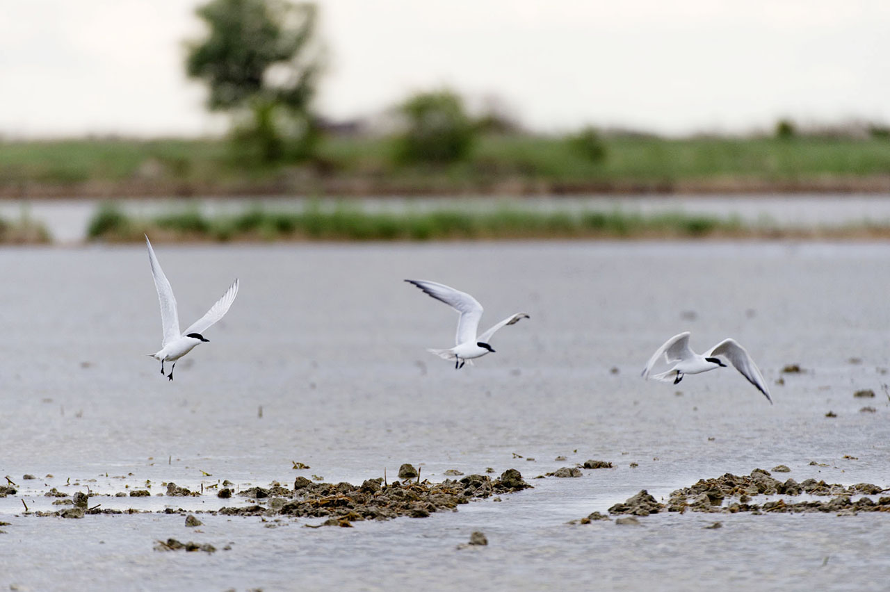Beskrivelse: Sandterner rastede langt inde i landet på våde marker, pga storm fra syd.