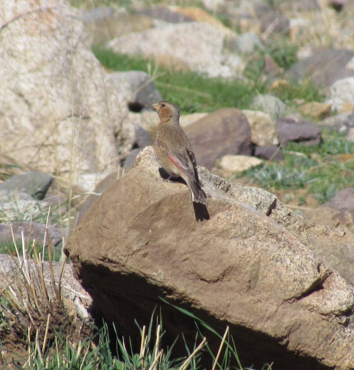 Beskrivelse: ssp alienus. Den nordafrikanske race regnes oftest som selvstændig art nu - Afrikansk Karmoisinfinke. Den klassiske lokalitet for arten er skisportsstedet Oukaïmeden i nærheden af Marrakech, hvor den især om vinteren kan være ganske talrig. Blev lidt nervøs da jeg ankom til området sidst i april, og så, at der kun lå små pletter af sne tilbage på skråningerne, men heldigvis blev en lille håndfuld fugle hurtigt fundet få hundrede meter langs grusvejen ovenfor den øverste skilift.