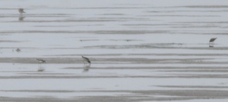 Beskrivelse: Fuglen ses nederst til venstre. Umiddelbart til højre ses en Hvidklire og længst til højre ses en Rødben. Fuglen blev fundet ude på selve vadefladen. Det er atypisk for Damklire at fouragere på en tidevandsflade, så det var selvfølgelig lidt af en overraskelse. Fuglen gik sammen med en hel del vadefugle, der var trukket ud inde fra Saltvandssøen. Billedkvaliteten er ikke noget af prale af, men fuglen gik også på 500-600m i tiltagende varmeflimmer, da solen så småt var ved at bryde gennem skylaget. Fuglen er i en "underudviklet" sommerdragt. Det kan derfor godt være en 2K, men da Damklire påbegynder fældningen meget tidligt, er en 3K+ også en mulighed. De mørke tegninger på brystet, manglende mørk kalot og mørke øredækfjer (set i felten) udelukker 1K.