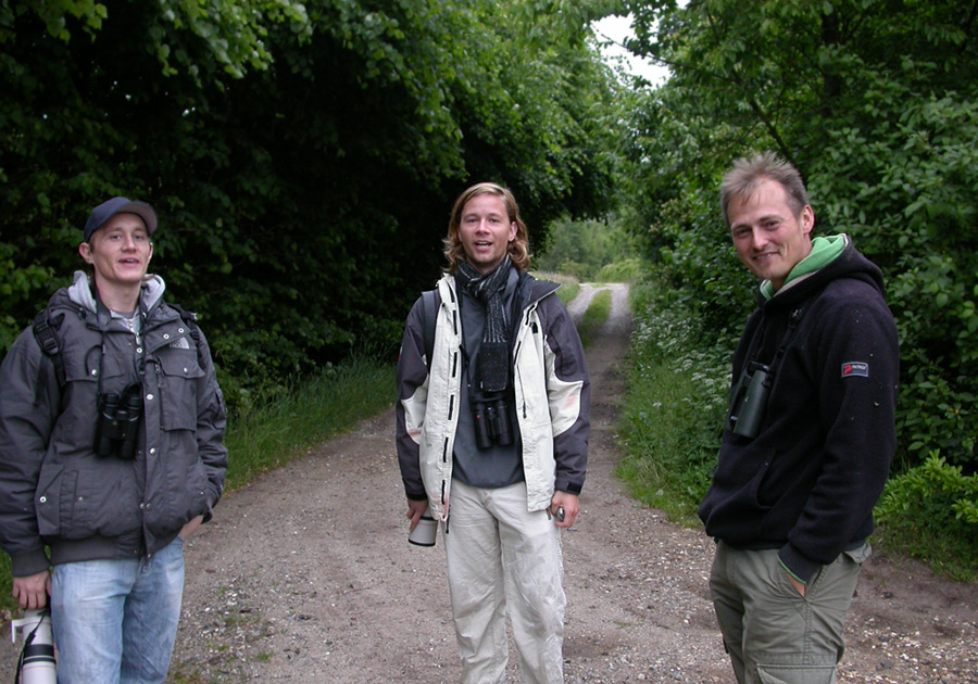 Beskrivelse: Til højre ses de to Aarhusbirdere Stephan Skaarup Lund (SSL) og Rasmus Due Nielsen (RDN) samt længst til venstre ses Kent Olsen (KO), som var finderen af genstanden for dette twitch, nemlig Buskrørsangeren ved Korup Sø, som var den første af to fugle på Djursland i sommeren 2008.