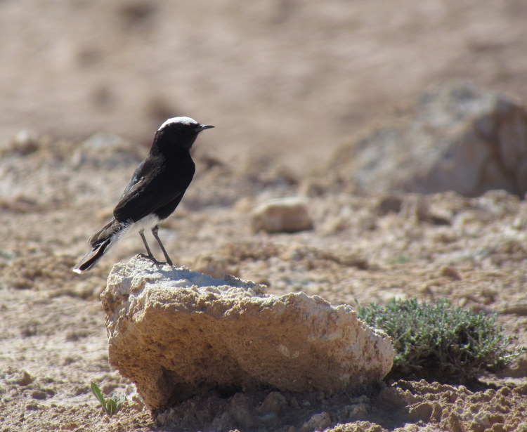 Beskrivelse: Turens første, forgæves, eftersøgning af Maghreb Wheatear gav da i det mindste en Hvidkronet Stenpikker. Arten har en dejlig evne til at dukke op i de mest trøstesløse og bare områder, lige som man tror, at 'her findes ingen fugle'.