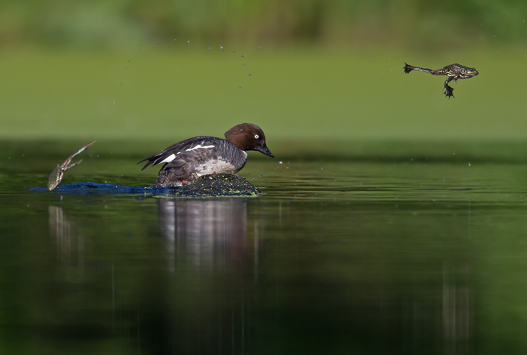 Frøerne lå og solede sig, da anden ville have pladsen, og måske en lille snack? Men de sprang for livet da anden invaderede stammmen!