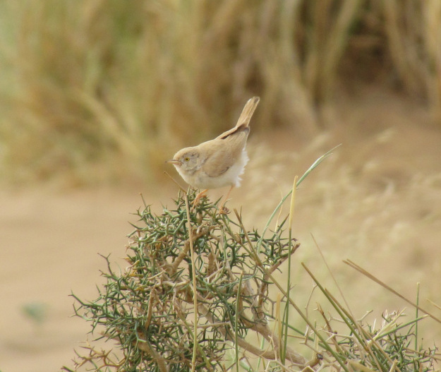 Selv om bevoksningen var sparsom, kunne fuglene let forsvinde i perioder, hvor de søgte føde inde i tuerne, men udover enkelte syngende Hærfuglelærker og overflyvende Plettede Sandhøns, var Ørkensangerens sang, den eneste som brød stilheden.