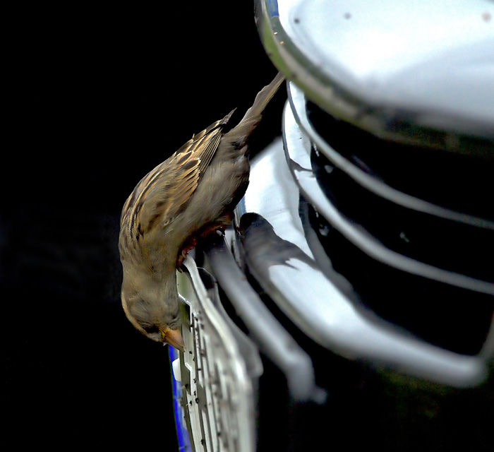 Beskrivelse: Utsjoki i Finland ligger tæt ved grænsen til Norge,hvorfor mange biler ankommer for at tanke op og købe ind. Gråspurvene her har åbenbart også fundet sig en lille niche,idet de forbløffende målrettet farer ned til især firhjulstrækkeragtige biler med store,dybe kølergitre og forsvinder lynhurtigt derind, ofte allerede inden bilen helt er standset ved benzinpumpen,så kun den ivrige hale ses. De har ca 2 minutter,som udnyttes effektivt,også lygter og vinduesviskere får lige et rutineret tjek for friske insekter.Derpå forsvinder de op til ungerne med næbbene fulde. De holdende biler inspiceres hoppende ned hen ad P-pladsen,da der måske kunne være enkelte friske insekter tilbage. Som her en fouragerende Gråspurv igang med nummerpladerne. Har bilerne holdt i længere tid,har de ikke helt samme interesse – så de tager nok de helt friske,lune bilmyg og vejinsekter,som det på disse egne vrimler så meget med,at der i sommertiden sidder næsten sortuldne lag på de forreste dele af bilerne.