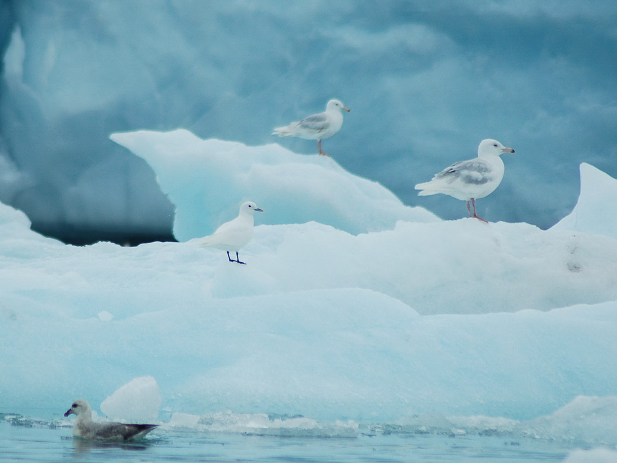 Beskrivelse: Sammen med Gråmåger og Mallemuk i den blå is.