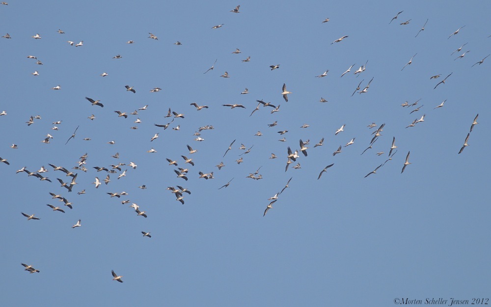 Beskrivelse: Over søen Atanasovsko kredsede kæmpe flokke af Pelikaner.Både hvide og Krøltoppede.