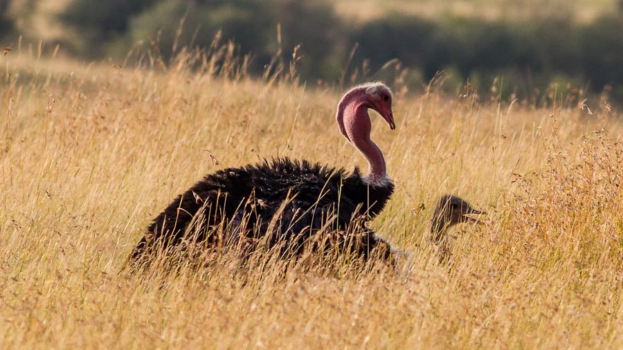Beskrivelse: Masaistruds i parring, hvor hannens hals bluser voldsomt op, samtidig med at den pustes op.