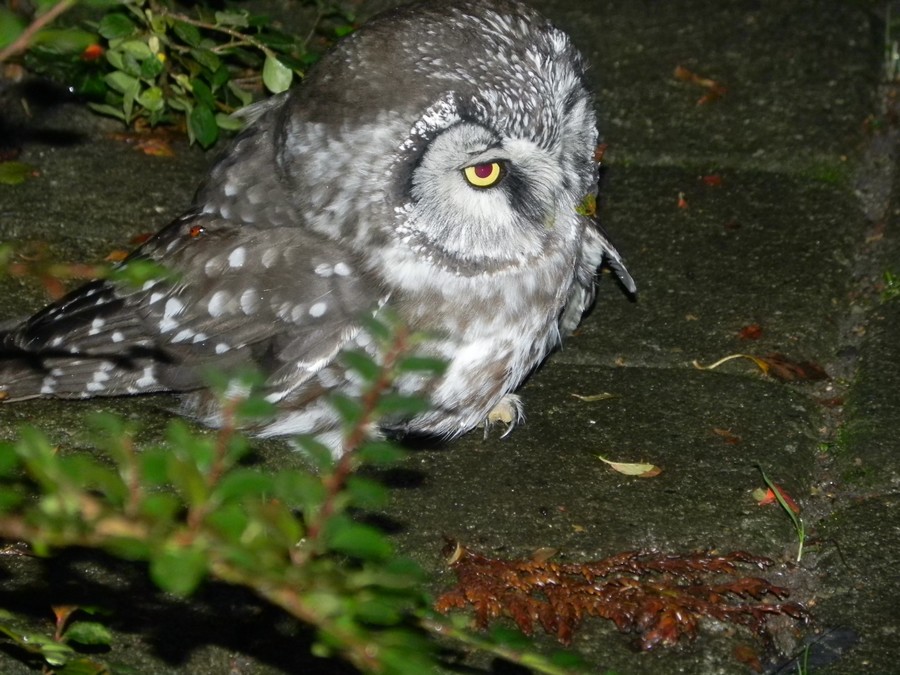 Den var lidt groggy. Som det måske kan ses på billedet, hvor den sidder på havegangen. Da jeg ville tjekke om den var kommet noget til, fløj den op i et træ.