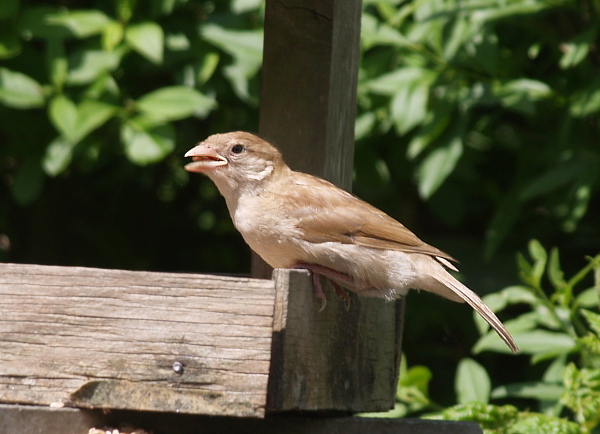 Beskrivelse: Billedet er taget gennem en rude. Havde 2 leucistiske Gråspurve i haven. En han Gråspurve og den ene leucistiske fugl fodrede ungerne, hvor af den ene også var leucistisk. Formoder derfor at de to fejlfarvede er en adult hun og en juvenil hun.