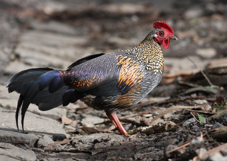 Beskrivelse: Grey Junglefowl fra Sydindien er udbredt i mange habitattyper, men ikke nær så almindelig som Red Junglefowl er i det nordlige. Faktisk opfattede vi den som halvsjælden. Måske fordi den efter sigende er meget efterstræbt, pga dens fjer som anvendes på kroge til lystfiskerformål.