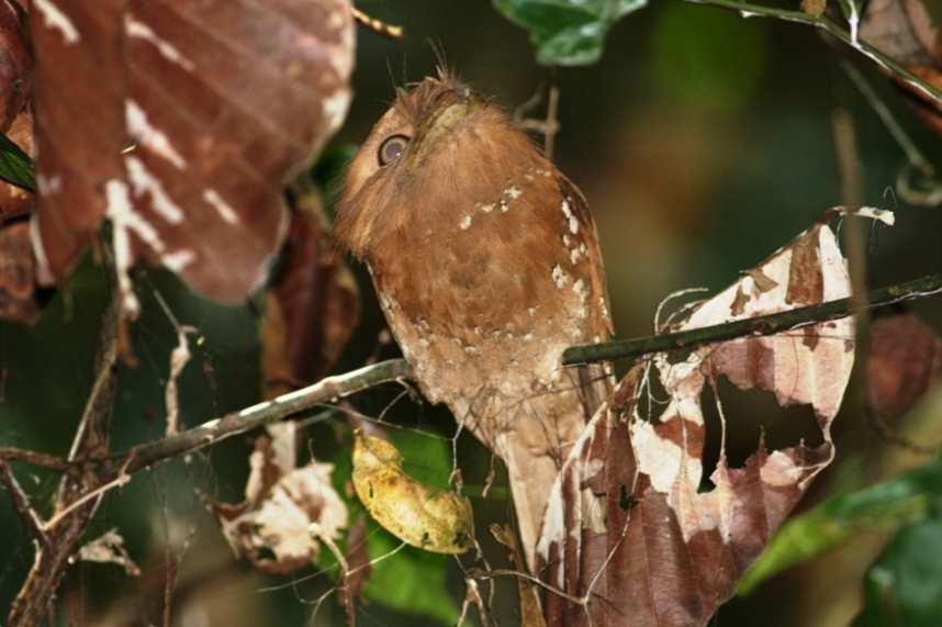 Beskrivelse: Vi fandt 3 frømunde på day-roost, siddende i buske i øjenhøjde. De er kendt for at blive siddende næsten uanset hvad, nogle indere gik helt ind på en halv meter af dem og tog billeder, og de lod sig ikke ænse af det. Helt så nærgående valgte vi andre dog ikke at blive.