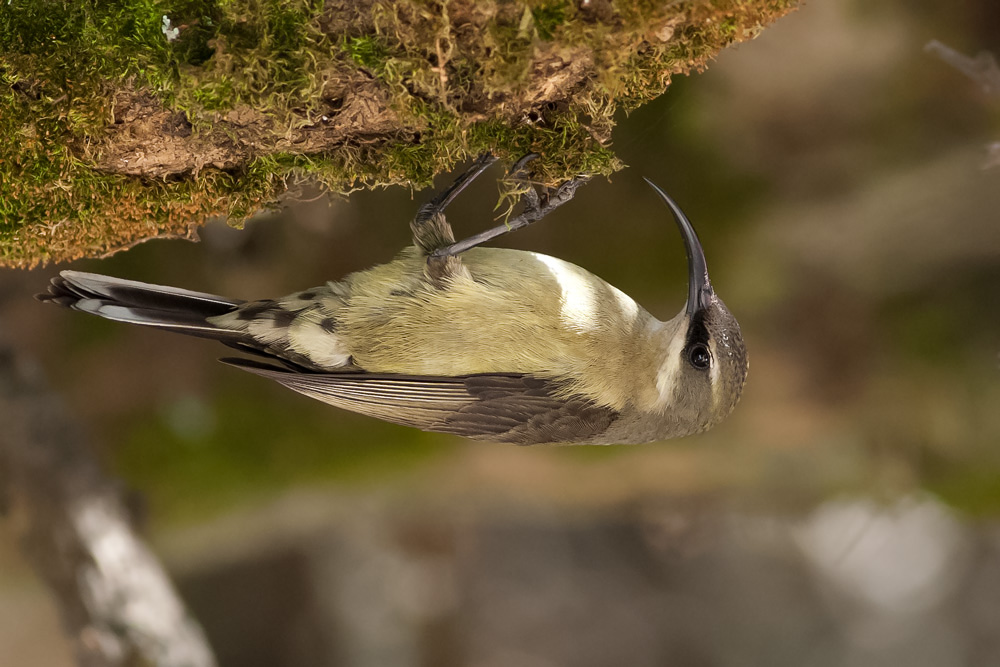 Beskrivelse: Ligesom hos Montane White-eye, har jeg ofte oplevet træløber eller spætmejse-lignende adfærd hos denne art. Fuglene klatrer rundt på stammer og grene mens de fouragerer - i ekstreme tilfælde, som her, med hovedet nedad på bedste spætmejse maner!
