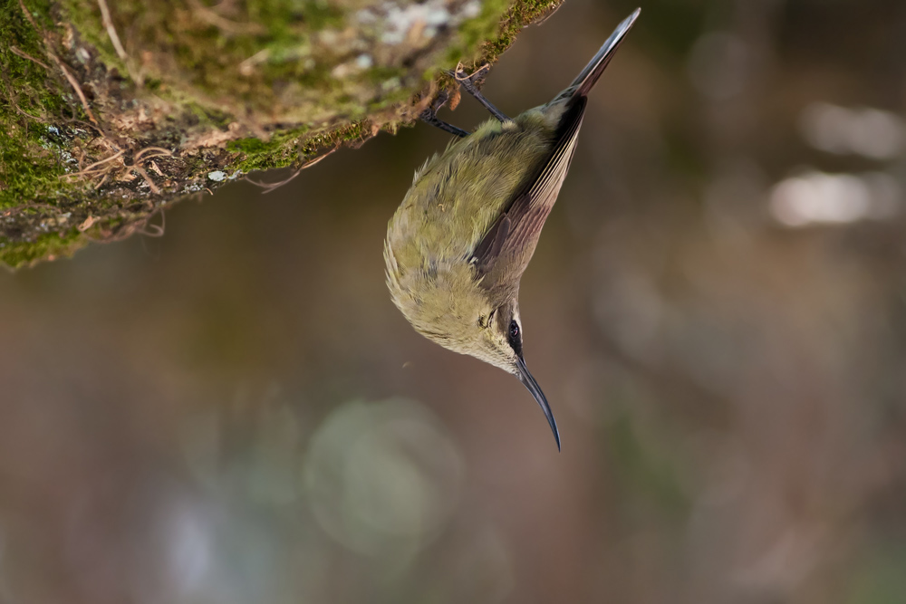 Beskrivelse: Ligesom hos Montane White-eye, har jeg ofte oplevet træløber eller spætmejse-lignende adfærd hos denne art. Fuglene klatrer rundt på stammer og grene mens de fouragerer - i ekstreme tilfælde, som her, med hovedet nedad på bedste spætmejse maner! Dette er sandsynligvis en ungfugl pga den ret gullige underside.