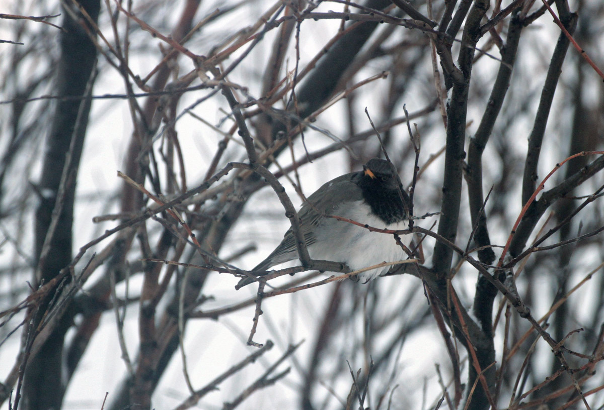 Beskrivelse: En svarthalsad trast har uppehållit sig vid ett fågelbord i Mehamn under en vecka nu. Idag fick vi reda på det och åkte dit.