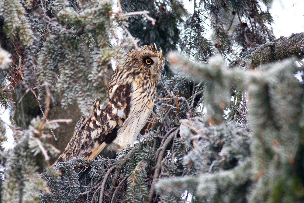 Jeg mindes faktisk aldrig have set en mosehornugle sidde i et grantræ, hvis den overhovedet sætter sig på andet end jorden, er det højst en pæl.