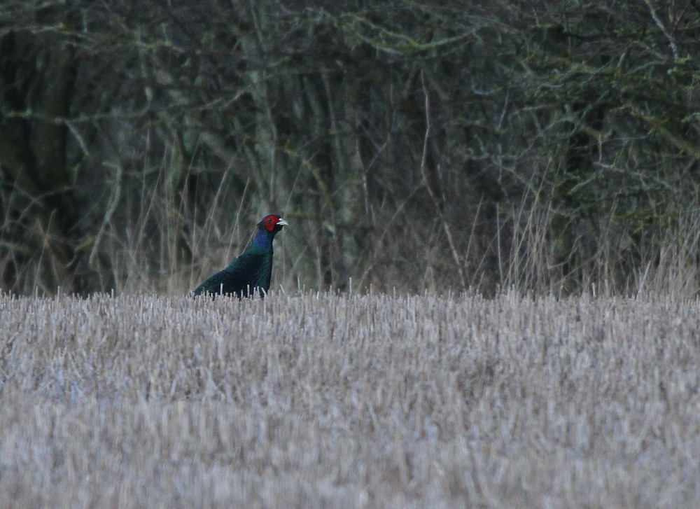Beskrivelse: Dette foto i mindre god kvalitet blev taget fra bilen på vej hjem fra fugletur. Jeg formoder, det er en grøn fasan. Jeg har aldrig tidligere set en sådan, men kan dog læse mig til, at de findes. Er det anslået, hvor stor en procentdel fasaner i Dk, der er grønne?