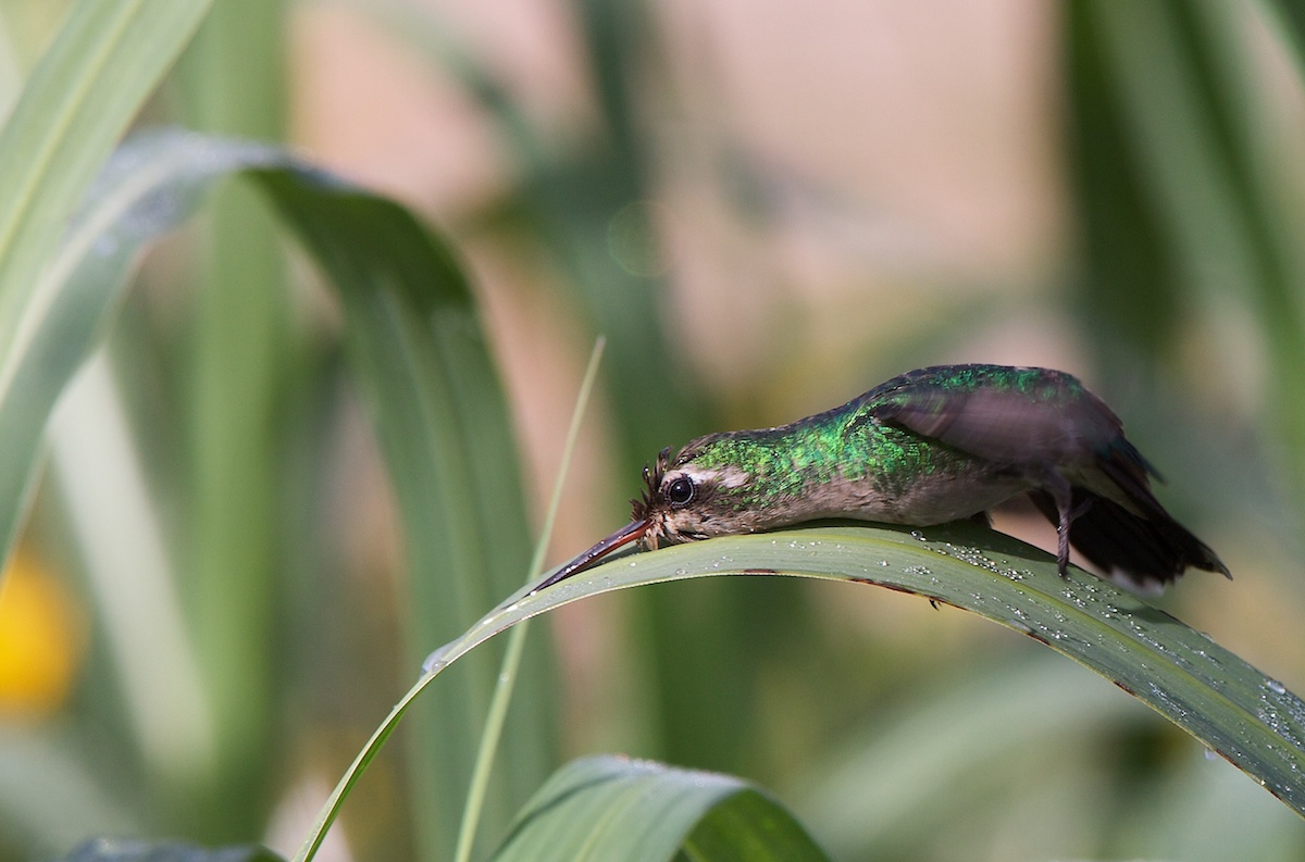 Beskrivelse: Efter nattens kraftige regn så denne kolibri ud til at bruge de våde sivblade som en form for vandrutsjebane. Jeg tror den tog bad.