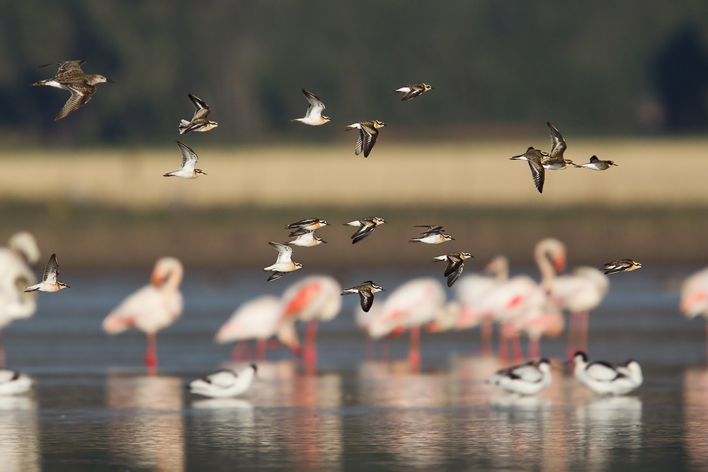 Beskrivelse: Der er også en enkelt Brushane i flokken (øverst til venstre)